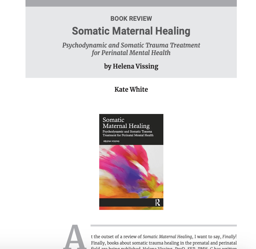 It’s been about half a year since my book, Somatic Maternal Healing, was published, and it is such a joy to see it make its way into the world, finding the people it was written for. You can listen to an interview with me about the book on the New Books in Psychoanalysis podcast. Or take a browse through the table of contents and read the introduction here. I am very grateful to Kate White who wrote a review of the book in the latest issue of the International Body Psychotherapy Journal which is open-source (including the entire archive!).